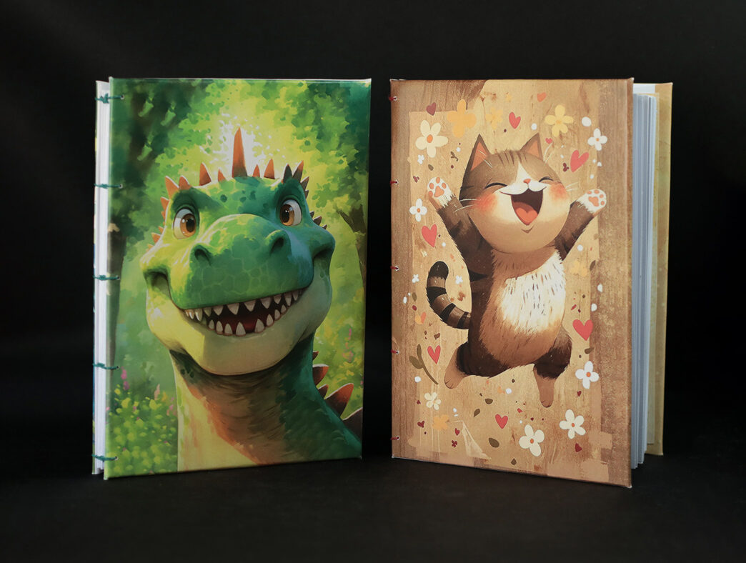 La couverture est composé d’un dos de cadre et d’un papier fantaisie. Une feuille de couleur unie est collé à l’intérieur. Les feuilles d’écriture sont blanches et lisses. Le tout est assemblé par un fil de lin avec la méthode de la reliure Copte, technique qui permet une ouverture totale du carnet.
